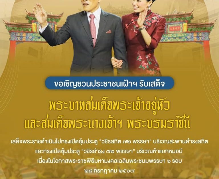 ขอเชิญชวนประชาชนเฝ้าฯ รับเสด็จ… 22 มกราคม 2025 โดย admin / ข่าวกิจกรรม,ข่าวประชาสัมพันธ์ ขอเชิญชวนประชาชนเฝ้าฯ รับเสด็จ พระบาทสมเด็จพระเจ้าอยู่หัว และสมเด็จพระนางเจ้าฯ พระบรมราชินี เสด็จพระราชดำเนินไปทรงเปิดซุ้มประตู “วชิรสถิต ๗๒ พรรษา” บริเวณสะพานดำรงสถิต และทรงเปิดซุ้มประตู “วชิรธำรง ๗๒ พรรษา” บริเวณห้าแยกหมอมี เนื่องในโอกาสพระราชพิธีมหามงคลเฉลิมพระชนมพรรษา ๖ รอบ ๒๘ กรกฎาคม ๒๕๖๗ ณ ถนนเจริญกรุง เขตพระนคร กรุงเทพมหานคร วันเสาร์ที่ ๒๕ มกราคม ๒๕๖๘ เวลา ๑๗.๐๐ น#พระราชพิธีมหามงคลเฉลิมพระชนมพรรษา๖รอบ#ซุ้มประตูวชิรสถิต๗๒พรรษา#ซุ้มประตูวชิรธำรง๗๒พรรษา
