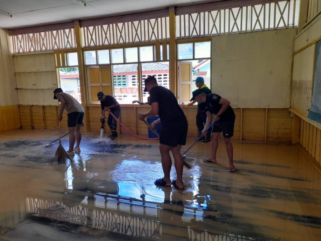 ตำรวจ ละงู พร้อมด้วย นสต. ร่วมฟื้นฟูปรับสภาพพื้นที่ รร.อนุบาลละงู หลงน้ำลด 1 ธันวาคม 2025 โดย admin / ข่าวกิจกรรม,ข่าวประชาสัมพันธ์,ข่าวภารกิจผู้บังคับบัญชา,งานชุมชนสัมพันธ์,ธันวาคม 2568 ตำรวจ สภ.ละงู ร่วมกิจกรรมฟื้นฟูพื้นที่ หลังสถานการณ์น้ำลด(อ.ละงู, สตูล) – วันที่ 1 ธันวาคม 2568รายงานข่าวจาก สภ.ละงู แจ้งว่า วันนี้ (1 ธ.ค. 2568) เวลา 09.00 น. พ.ต.อ.เอกณัฏฐ์ เหลืองแดง ผกก.สภ.ละงู ได้สั่งการให้เจ้าหน้าที่ตำรวจเข้าร่วมกิจกรรมบำเพ็ญประโยชน์เพื่อฟื้นฟูพื้นที่หลังน้ำท่วม โดยได้มอบหมายให้ พ.ต.ต.วิทยา บ่อเตยสวป.(ชส).สภ.ละงู เป็นผู้นำกำลังเจ้าหน้าที่ตำรวจ พร้อมด้วย นักเรียนนายสิบตำรวจ (นสต.) ที่อยู่ระหว่างการฝึกปฏิบัติงาน ณ สภ.ละงู กำลังพลชุดดังกล่าวได้เข้าร่วมกิจกรรมจิตอาสา ทำความสะอาดและฟื้นฟูโรงเรียนอนุบาลละงู ซึ่งได้รับความเสียหายจากสถานการณ์น้ำท่วม เพื่อเป็นการช่วยบรรเทาความเดือดร้อนและสนับสนุนให้สถานศึกษาสามารถกลับมาเปิดดำเนินการได้ตามปกติโดยเร็ว