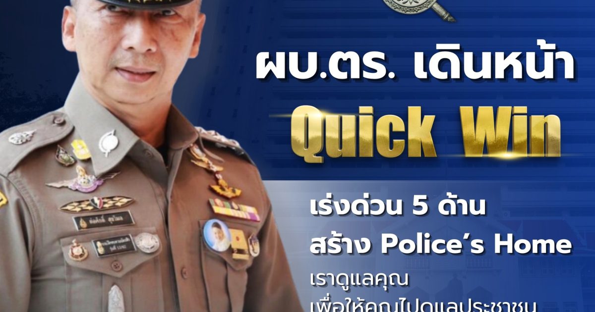 นอกจากนี้ยังได้กำหนดแผนปฏิบัติการเร่งรัด หรือ Quick Win 5 ด้าน ทำสิ่งที่สามารถทำได้รวดเร็ว สร้างผลลัพธ์เป็นรูปธรรม ให้เห็นผลชัดเจนมากที่สุด ภายใต้แนวคิด Police’s Home ประกอบด้วย ด้านบุคลากร ระบบ สวัสดิการ ความสามัคคีความเป็นธรรมและช่องทางการสื่อสารในองค์กร และการสร้างภาพลักษณ์ตำรวจที่ดีให้ประชาชนเชื่อมั่นศรัทธา อาทิ