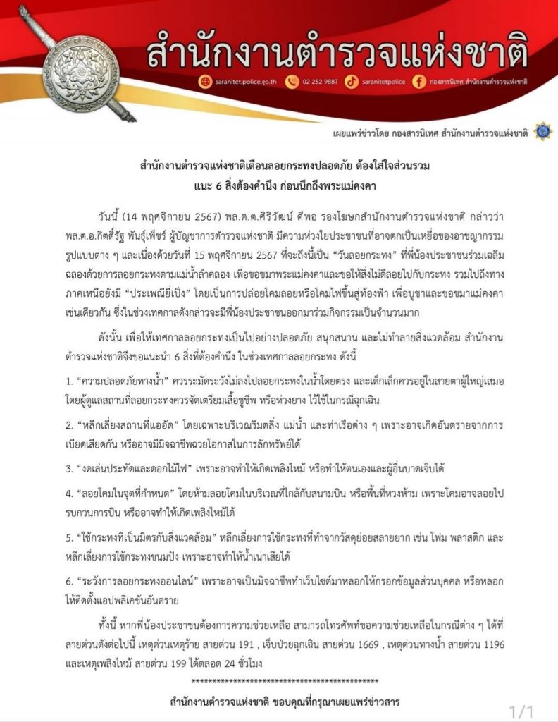 ลอยกระทง 67 มี 6 สิ่งที่ต้องคำนึง.. 15 พฤศจิกายน 2567 โดย admin / ข่าวประชาสัมพันธ์ FacebookFacebookXXLINELine