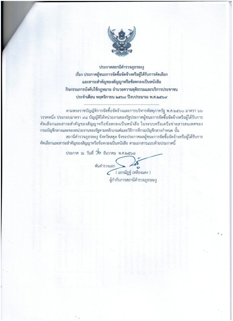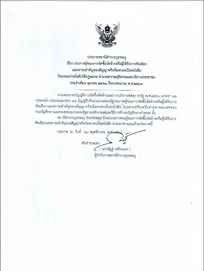 ประกาศสถานีตำรวจภูธรละงู เรื่อง ประกาศผู้ชนะจัดซื้อจัดจ้างหรือผู้ได้รับคัดเลือกและสาระสำคัญของสัญญาหรือข้อตกลงเป็นหนังสือสำหรับใช้ในการปฏิบัติหน้าที่ราชการ กิจกรรมการบังคับใช้กฎหมาย อำนวยความยุติธรรมและบริการประชาชน ประจำเดือน พฤศจิกายน 2568 ประจำปีงบประมาณ พ.ศ.2569
