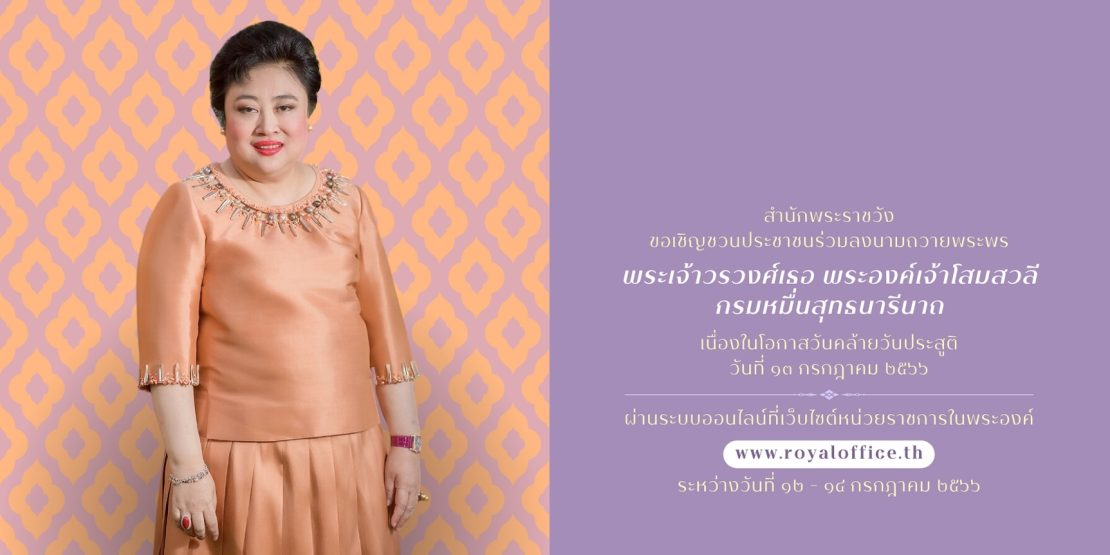 สำนักพระราชวัง ขอเชิญชวนประชาชนร่วมลงนามถวายพระพร พระเจ้าวรวงศ์เธอ พระองค์เจ้าโสมสวลี กรมหมื่นสุทธนารีนาถ เนื่องในโอกาสวันคล้ายวันประสูติ วันที่ ๑๓ กรกฎาคม ๒๕๖๖ ผ่านระบบออนไลน์