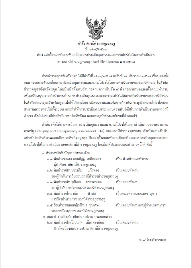 1) มีการออกคำสั่งแต่งตั้งคณะกรรมการขับเคลื่อนการประเมินคุณธรรมและความโปร่งใสในการดำเนินการของหน่วยงานภาครัฐ (ITA)2)