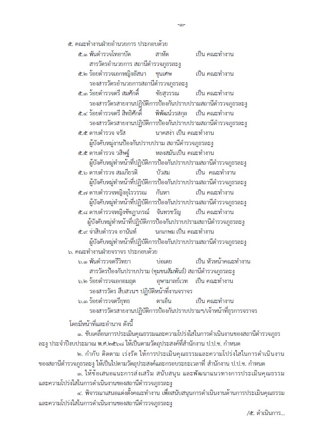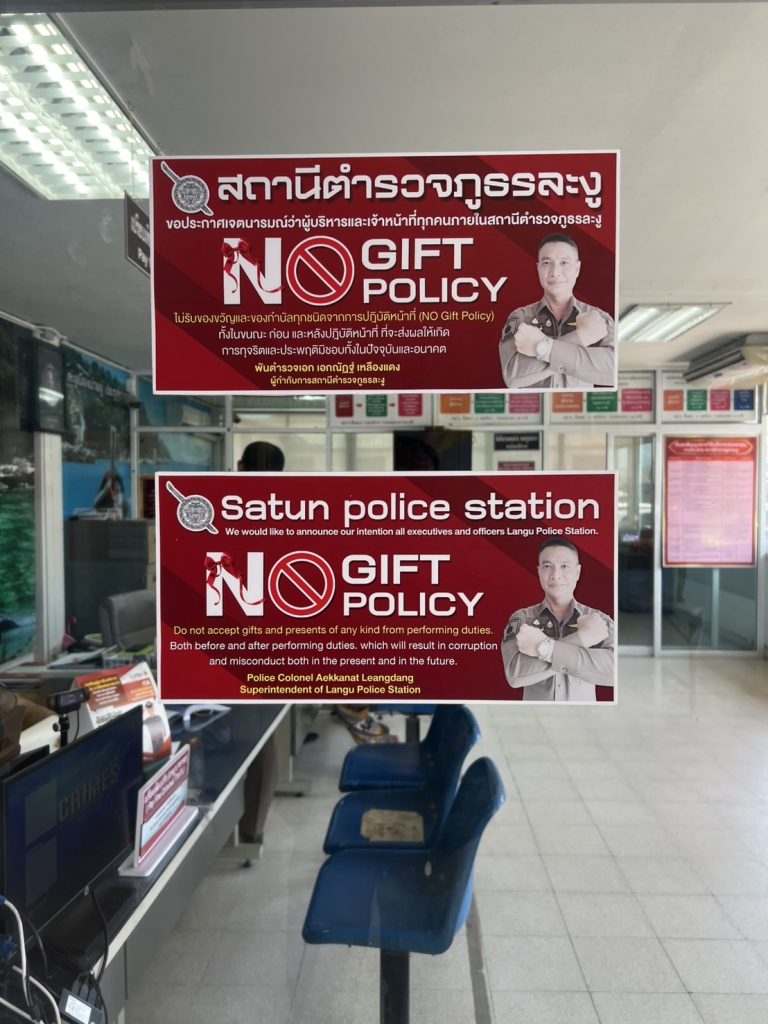 ติดไว้ในจุดบริการของสถานีตำรวจและทุกแผนกงานเพื่อให้ประชาชนทราบว่า สถานีตำรวจภูธรละงู ขอประกาศว่า เจ้าหน้าที่ทุกคนในสังกัดไม่รับของขวัญหรือของกำนัลจากการปฏิบัติหน้าที่และต่อต้านการรับสินบนทุกประเภท