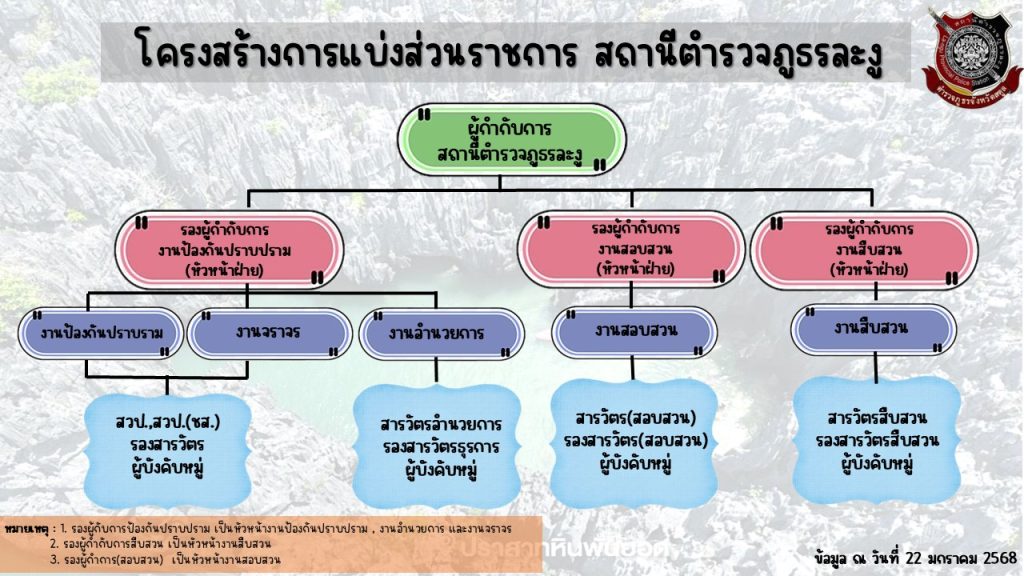 พระราชกฤษฎี (ส่วนราชการระดับ บช.) กฎกระทรวง (ส่วนราชการระดับ บก.ลงมา) และประกาศ ตร. (กำหนดพื้นที่รับผิดชอบทุกสถานี/หน่วย)